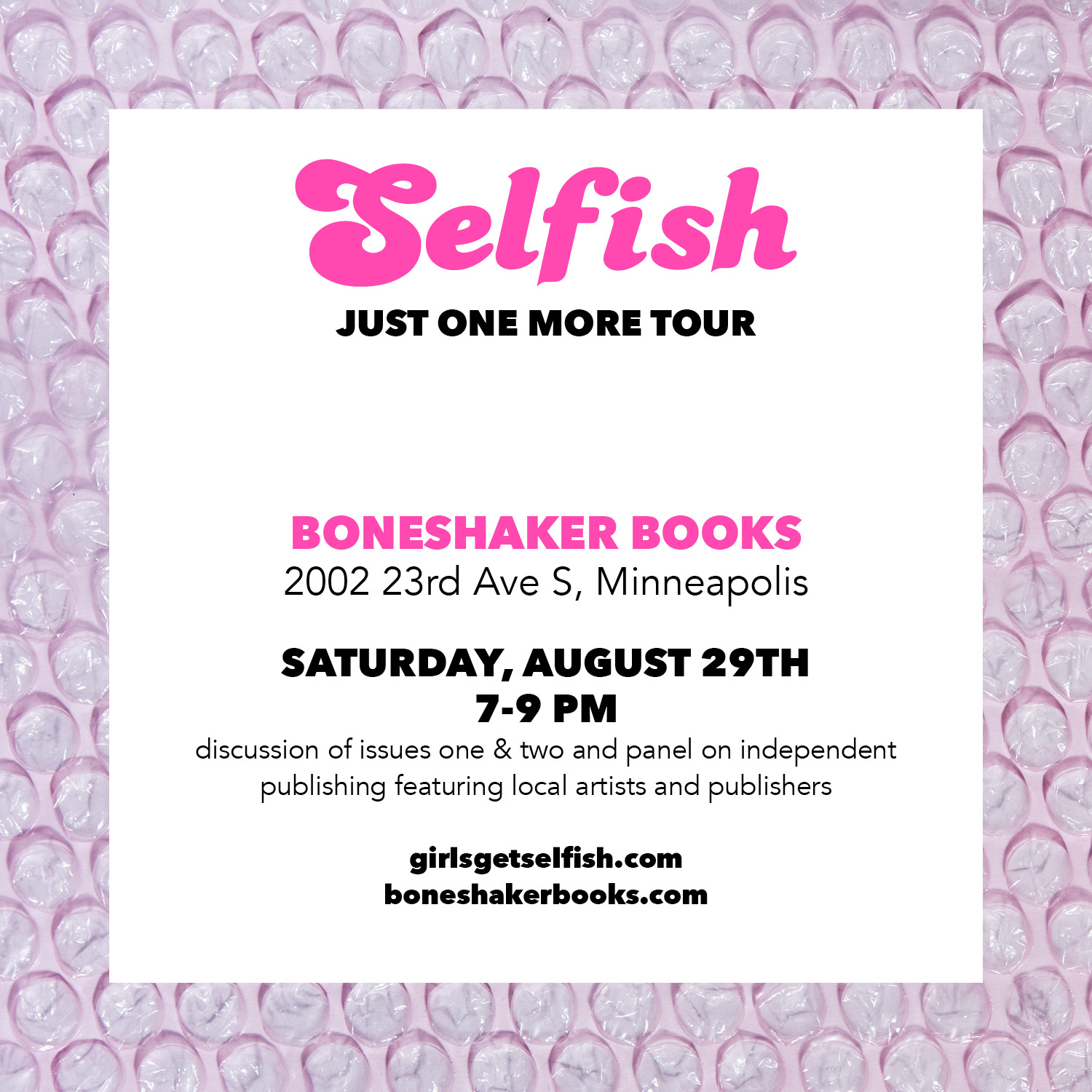 Selfish @ Boneshaker Books Saturday, August 29th in Minneapolis - join us for a panel with local artists // writers // publishers! taylor ursulaAugust 26, 20151 Comment Facebook0 Twitter LinkedIn0 Reddit Tumblr 0 Likes