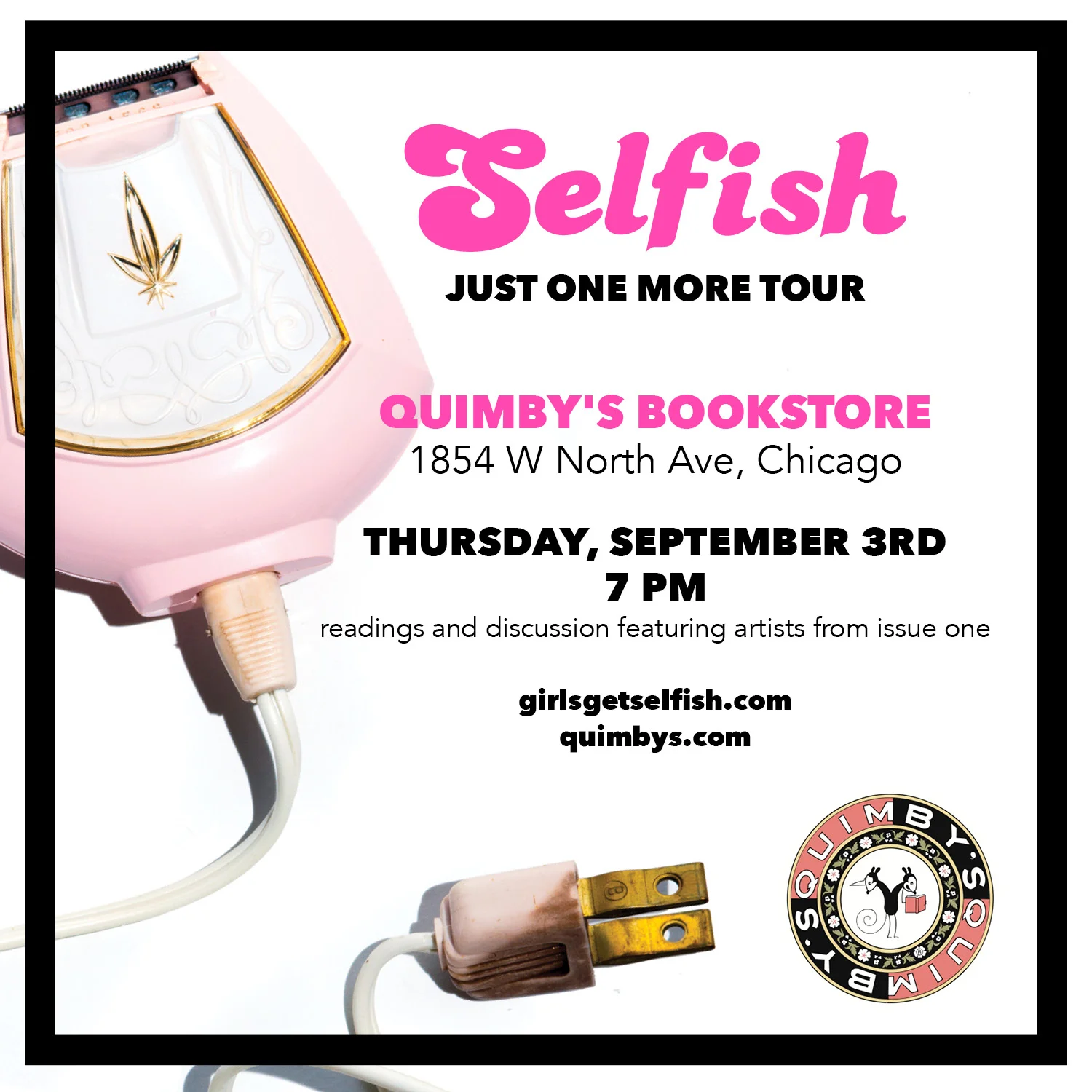 Selfish @ Quimby's Bookstore Thursday, September 3rd - issue one author Taylor Evelyn Yates and poetry editor Alys Velazquez will read their work from the issues as well as participate in a project panel. see you there! taylor ursulaAugust 31, 2015Comment Facebook0 Twitter LinkedIn0 Reddit Tumblr 0 Likes