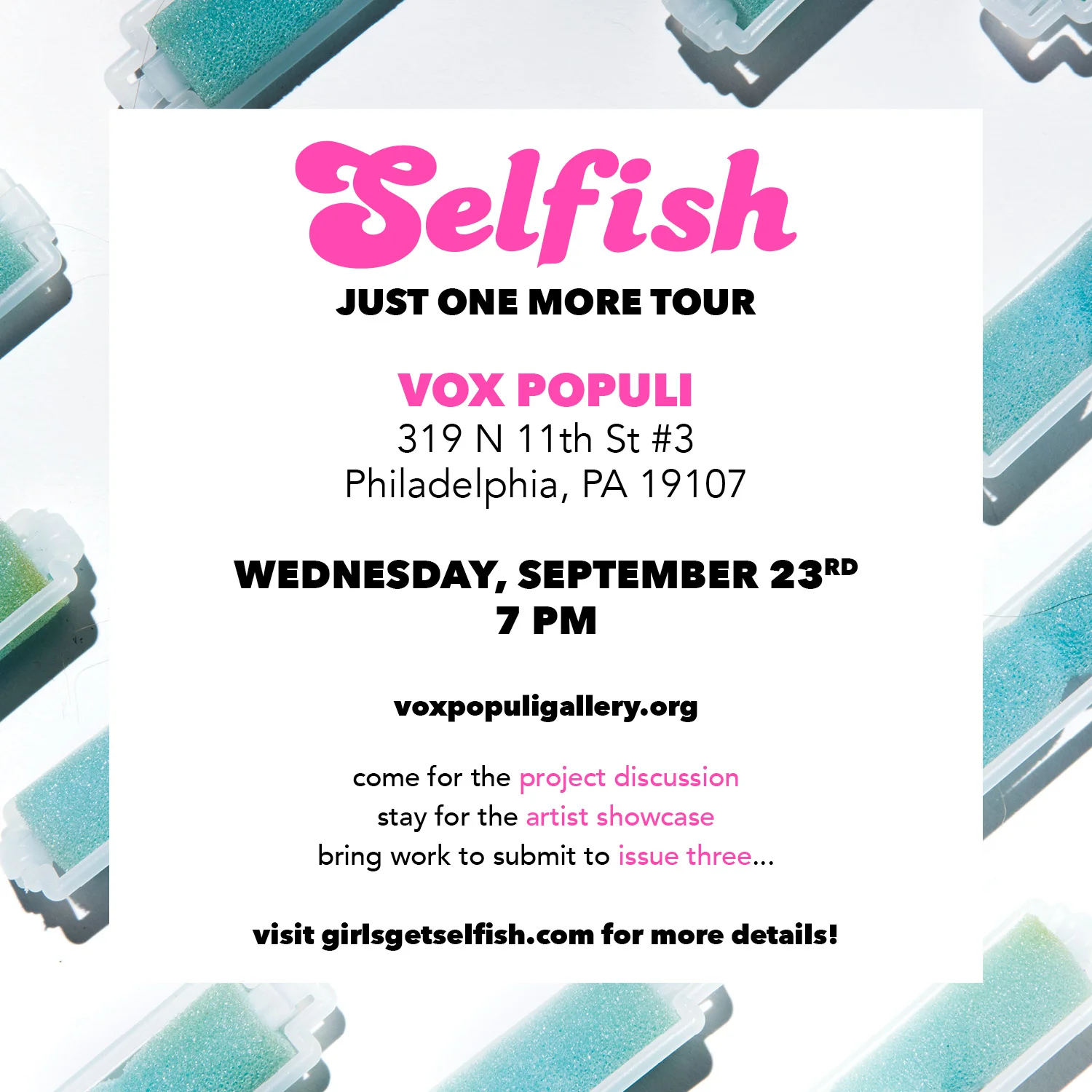 the last stop on the Just One More tour - Wednesday, September 23rd at Vox Populi in Philadelphia. this super awesome event will feature an artist showcase with poet Megan Bealer, photographer Megan Kelly, and poetry editor Alys Velazquez - and YOU are invited to bring in your artwork, writing, and zines to share with us! we'll also be officially opening up submissions for issue three....come check it out!